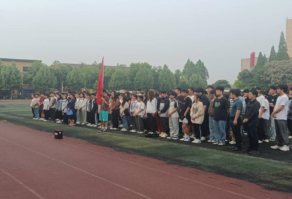 于东校区田径场举行2024年春季学期升旗仪式。学院党委副书记杨会军、学工办主任刘敬敏、辅导员王娜、王陈、周学素和2021级、2022级全体本科生参加此次升旗仪式。升旗仪式由应化12202班高欢欢主持。