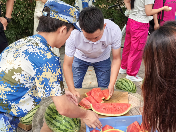 在西校区开展 “送温暖、送清凉”活动。辅导员周学素和蔡略老师带领学院学生会和青支队的成员,为2024级参加军训的学生及教官送上了清凉解暑的饮品和瓜果。