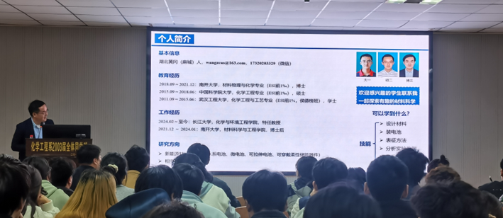 讲座由主题讲解与师生问答两部分组成。开场时,赖璐副院长向大家简要介绍了主讲人王昭老师。王昭老师来自湖北麻城,是中共党员,2021年毕业于南开大学材料物理与化学专业并取得博士学位,随后在南开大学从事博士后研究至2024年2月,同年受聘韩国无码