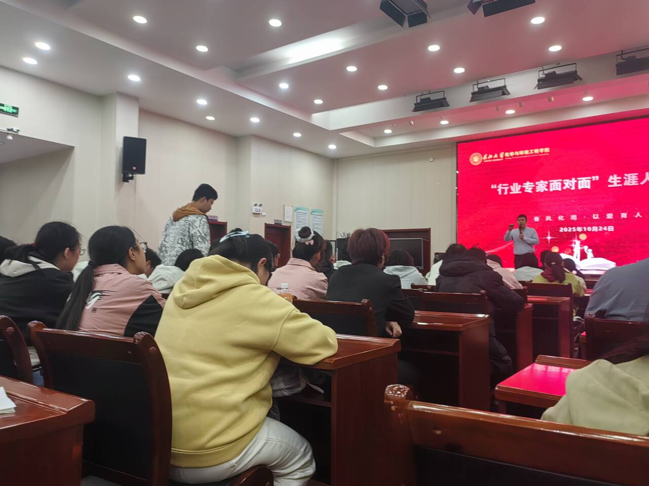 在生涯访谈环节,柯锦康针对"化学化工专业跨行业就业可行性""实习与考研时间分配"等具体问题提供定制化建议。2024级高材专业学生王同学表示:"柯老师用真实案例拆解了职业规划的迷雾,让我明确了'先扎根专业再拓展边界'的成长路径"。