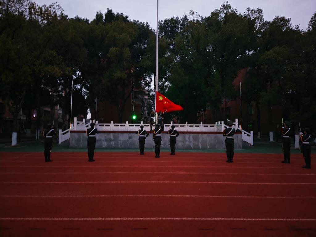 伴随着雄壮激昂的国歌声,鲜艳的五星红旗冉冉升起,全体师生肃立注目,齐声高唱国歌,表达对祖国的无限热爱与崇高敬意。