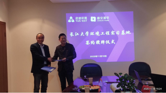 环境工程专业实习基地签约授牌仪式。签约仪式由荆清水务综合办公室主任王林栎主持,出席的有环工系主任魏平方、戴捷教授、荆清水务副总经理何中新、戈志诚、陈纬维等。