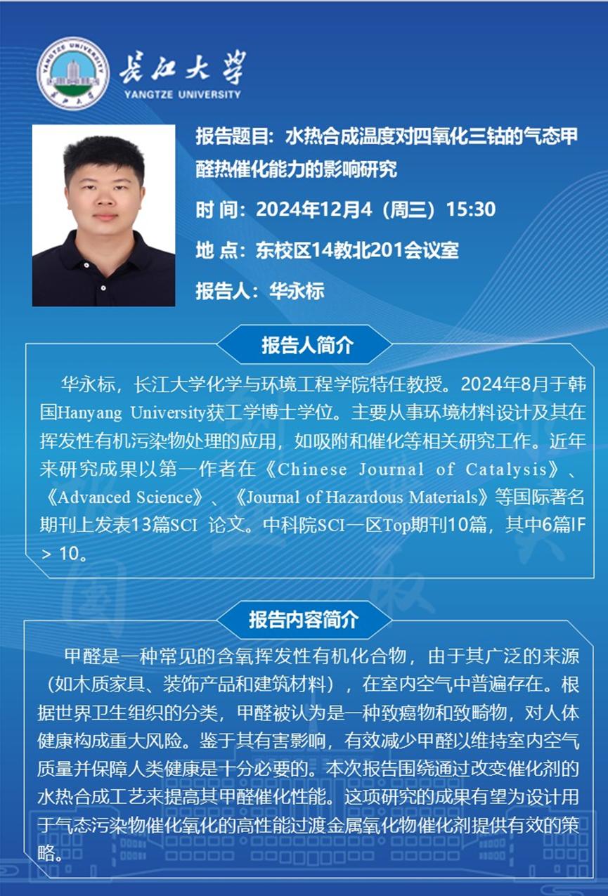 长江化工讲坛:水热合成温度对四氧化三钴的气态甲醛热催化能力的影响研究