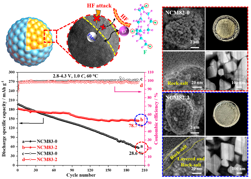LiNixCoyMn1-x-yO2 (0.6≤x<1, NCM)高镍三元正极材料凭借低制备成本、高理论容量被认为是极具潜力的下一代锂离子电池正极材料。然而,商业化应用受限于不稳定的结构及电极与电解质界面。利用氧化物、磷酸盐、氟化物及含锂化合物等对NCM正极材料表面进行修饰已被证明是一种有效改性措施。然而,无机包覆材料不足以缓解NCM正极在循环过程中产生的各向异性的应力应变,且多数包覆材料并不能从根本上解决HF侵蚀的问题。因此,优化正极材料与电解液之间的界面稳定性仍具有挑战性。