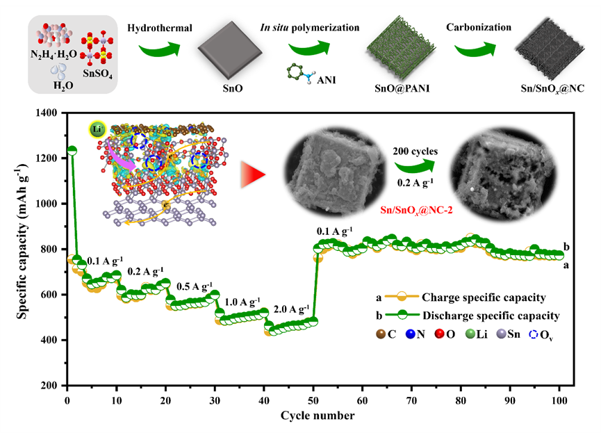 基于以上挑战,肖围教授课题组通过控温烧结构建金属-金属氧化物异质结,进一步选用导电聚合物进行原位包覆,探究了煅烧温度以及聚合物包覆量对锡基氧化物异质结构的影响。结果表明,微米片状SnO经过控温烧结后成功形成Sn/SnOx异质结构,材料导电性及氧空位浓度显著增加。Sn/SnOx@NC-2电极组装的电池表现出优异的循环性能,0.1 A/g,循环110次,放电比容量为730.4 mAh g-1,容量保持率为98.3 %;1.0 A/g,循环500次,放电比容量仍具有487.3 mAh g-1。异质结构及氧空位的引入有效地缩短了锂离子扩散路径,改善了界面电荷转移,提高了电化学反应可逆性;导电聚合物的原位包覆不仅形成了有效的缓冲涂层,且进一步降低了氧空位的形成能,协同提升储锂能力。该研究为锂离子电池锡基负极材料异质结构及氧空位的构建提供了参考。