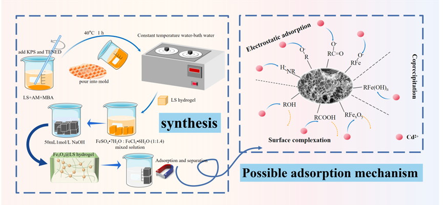 基于上述挑战,陈武教授课题组提出以木质素磺酸钠(LS)为原料,丙烯酰胺(AM)为单体,N,N’-亚甲基双丙烯酰胺(MBA)为交联剂,过硫酸钾(KPS)为引发剂,N,N,N’,N’-四乙基乙二胺(TEMED)为还原剂,采用自由基接枝共聚法成功合成木质素磺酸钠水凝胶,并采用原位沉淀法在水凝胶的内部负载磁性Fe3O4纳米粒子,形成磁性木质素磺酸钠水凝胶(Fe3O4@LS),再将Cd2+作为处理目标研究Fe3O4@LS对重金属的吸附效果。该合成方法工艺简单,环境友好,实现了对木质素的再利用,且Fe3O4@LS具有较大的比表面积、丰富的活性位点、优良的磁性和稳定性,对Cd2+的吸附容量可达88.00 mg/g,具有良好的吸附效果。吸附过程主要通过表面络合、阳离子交换和静电吸引完成。利用NaCl作为解吸剂,经过4次洗脱后,吸附率仍可达60%以上,具有较好的回用性。本研究为磁性水凝胶作为吸附材料在工业废水处理中的应用提供了理论和技术上的参考,并为开发高吸附效果、环境友好且易回收再利用的吸附材料提供了一个思路。