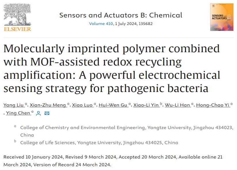 陈颖教授课题组在食源性致病菌的检测方面取得重要研究进展,相关研究成果以题为“Molecularly imprinted polymer combined with MOF-assisted redox recycling amplification: A powerful electrochemical sensing strategy for pathogenic bacteria”的学术论文发表于分析化学领域国际著名期刊《Sensors and Actuators B: Chemical》(IF=8.4,中科院一区Top期刊)上。硕士研究生刘洋为论文第一作者,陈颖教授为论文通讯作者。该研究受国家自然科学基金(21605007)和湖北省自然科学基金(2023AFB906)项目的资助。