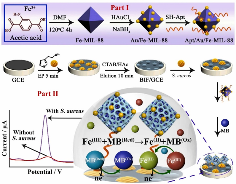 本研究通过将Apt组装在纳米金修饰的MOF表面制备具有靶标识别功能的纳米信号探针;通过电聚合和模板去除法在电极表面原位形成S. aureus细菌印迹层,作为捕获探针。当目标致病菌存在时,细菌印迹修饰电极捕获细菌,进一步与纳米信号探针结合形成夹心结构,继而固载大量亚甲基蓝(MB),通过与检测底液中的电活性[Fe(CN)6]3−/4−发生氧化还原循环反应以显著增强电化学响应信号。该方法由于将人工合成受体的双重识别及MOF调控下氧化还原循环放大相结合,展现出优异的分析性能,具有实际样品中细菌分析的巨大潜力。