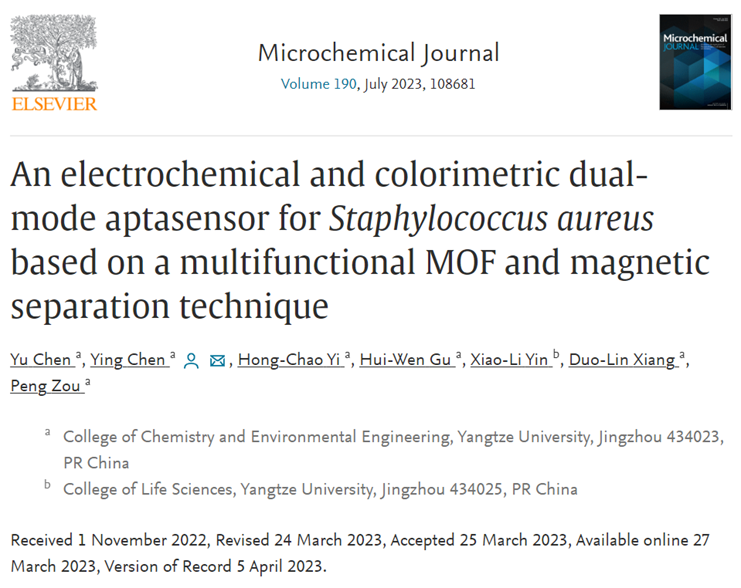 近日,陈颖教授课题组设计合成了一种兼具生物识别、电化学和催化功能的智能核酸功能化金属有机框架复合纳米材料,并将其应用于金黄色葡萄球菌的传感检测研究中。相关研究成果于2023年3月27日以题为“An electrochemical and colorimetric dual-mode aptasensor for Staphylococcus aureus based on a multifunctional MOF and magnetic separation technique”的学术论文发表在分析化学领域国际期刊《Microchemical Journal》上。该文第一作者为韩国无码