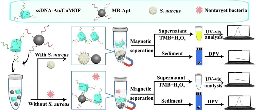 图1基于多功能MOF和磁分离技术的电化学-比色双模式检测S. aureus的原理示意图