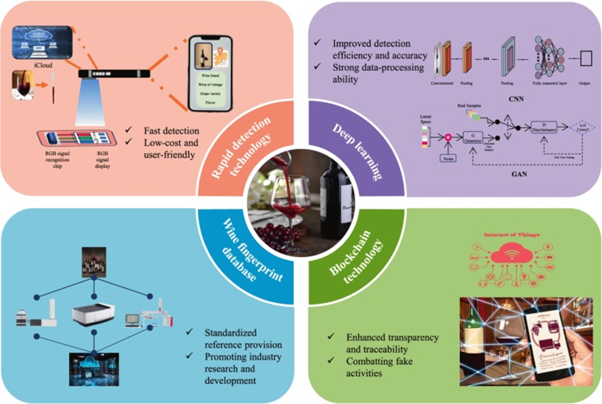 文章指出,通过将多种分析技术产生的复杂数据与机器学习算法相结合,可以显著提升对葡萄酒产地、品种和年份的判别准确率。研究特别强调了构建葡萄酒指纹数据库、发展基于深度学习的快速检测方法以及引入区块链技术以增强供应链透明度,是未来保障葡萄酒产业健康发展的关键方向。